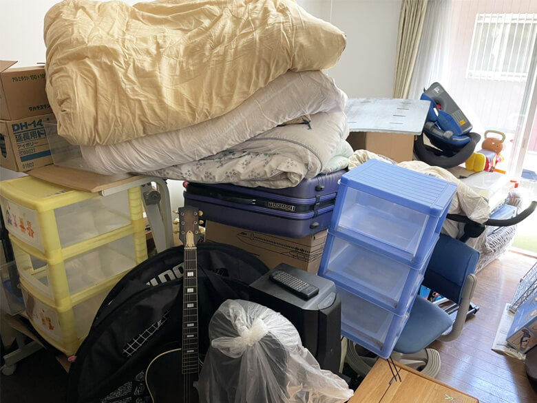 一人掛けソファー、布団7枚、水槽、スピーカー、小型家電類45リットルの袋×5、ドラム、ギター、雑品45リットルの袋×20〜30