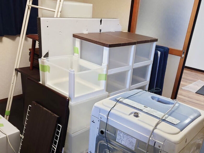 電子レンジ、洗濯機、四段衣装ケース×2、一段衣装ケース×3、勉強机、ウッドカーペット、物干し竿×3、ローテーブル、折り畳みテーブル、その他細々としたもの45リットル袋×1
