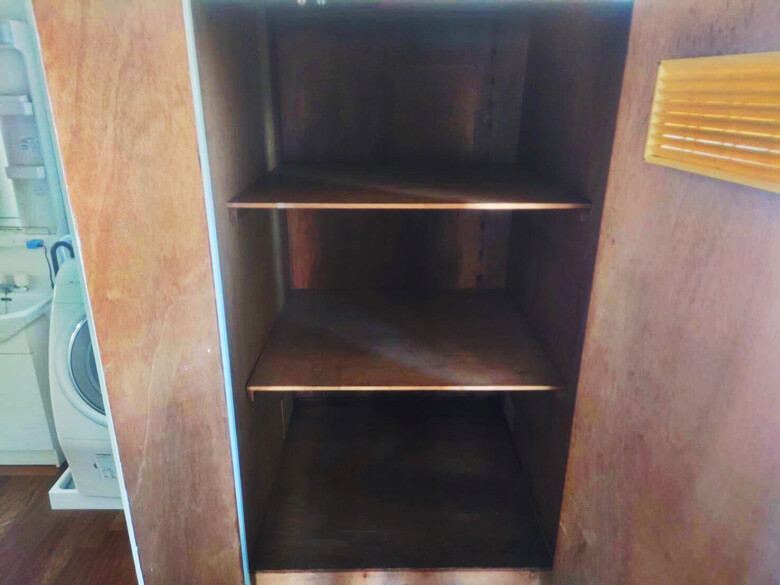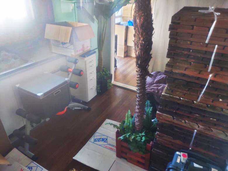 シングルベッド(引出し付き)、シングルベッドマットレス、布団二組、ウッドデッキ用パネル30、ノートパソコン、炊飯器、空気清浄機、扇風機、DVDプレーヤー、バット2、解体済み本棚2、観葉植物(造花)2、ガラステーブル、額縁3、腹筋マシン、すだれ、ブラインド、照明、キッチン収納棚