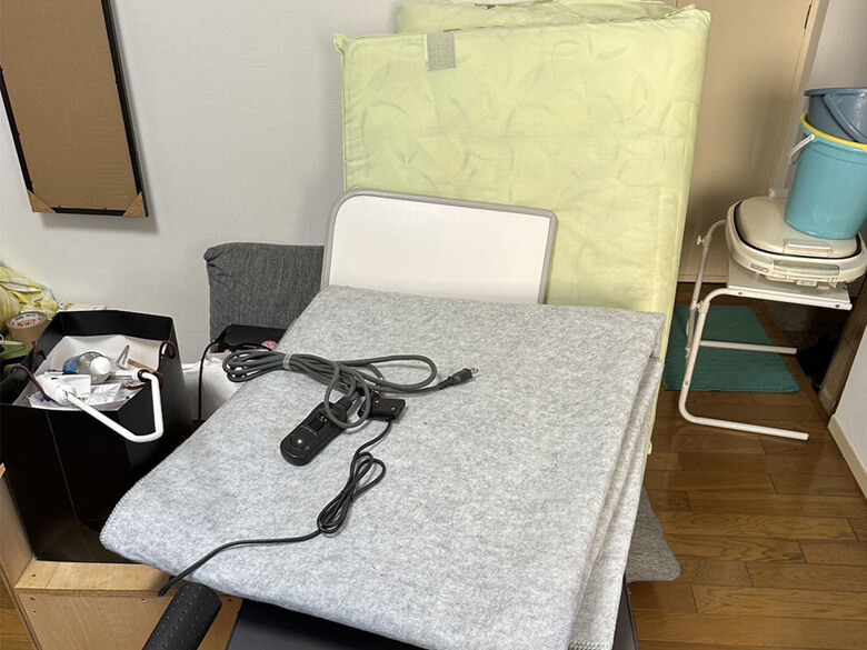 椅子、テーブル、ホットカーペット、敷布団、ボックス、細かなもの、洗濯機、冷蔵庫、二人掛け座椅子