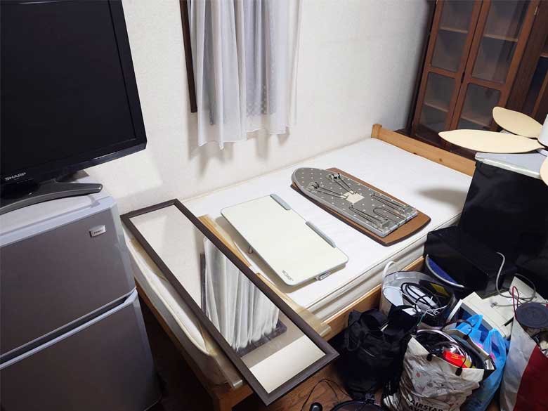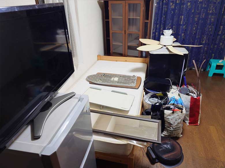 冷蔵庫2、テレビ、シングルベッド、シングルマットレス、本棚、姿見、シュレッダー、ロボット掃除機、コード・ケーブル類、小型家電、雑貨類、古紙類