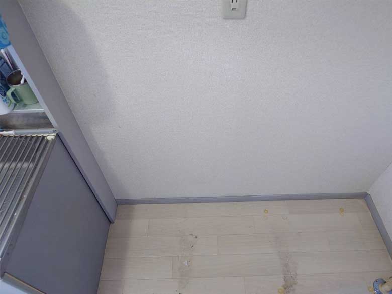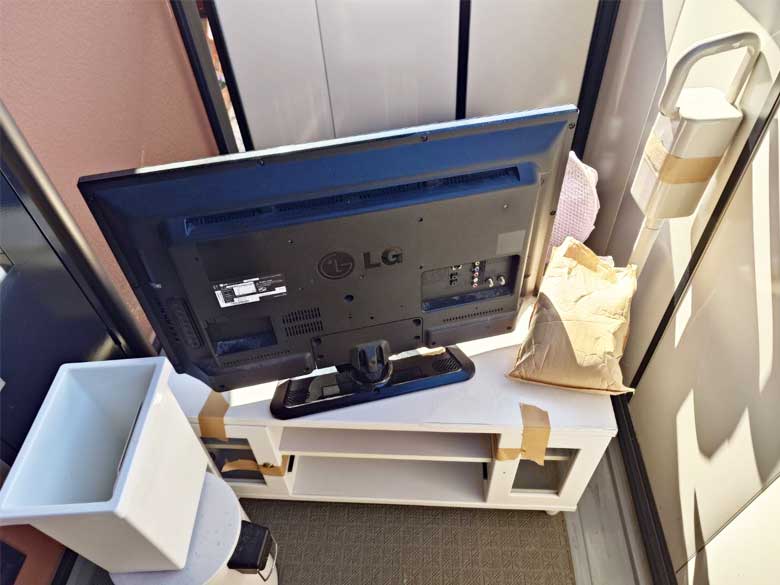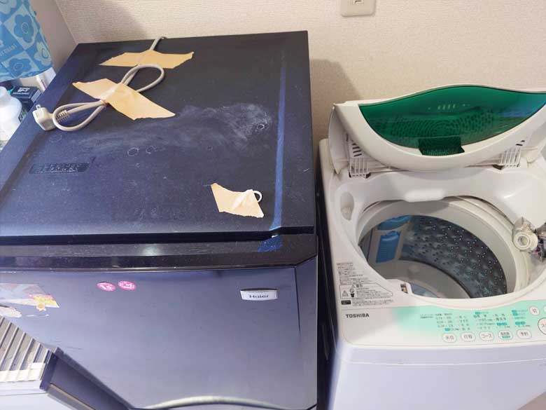 冷蔵庫、洗濯機、テレビ台、テレビ、ゴミ箱、スーツケース