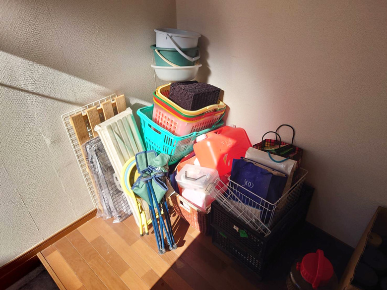 液晶テレビ、ブラウン管TV、ディスク式カラオケ機器一式、椅子、布団・寝具類10、日用品・雑貨類などダンボール20箱相当、プラケース20、タンス、衣類45L2袋