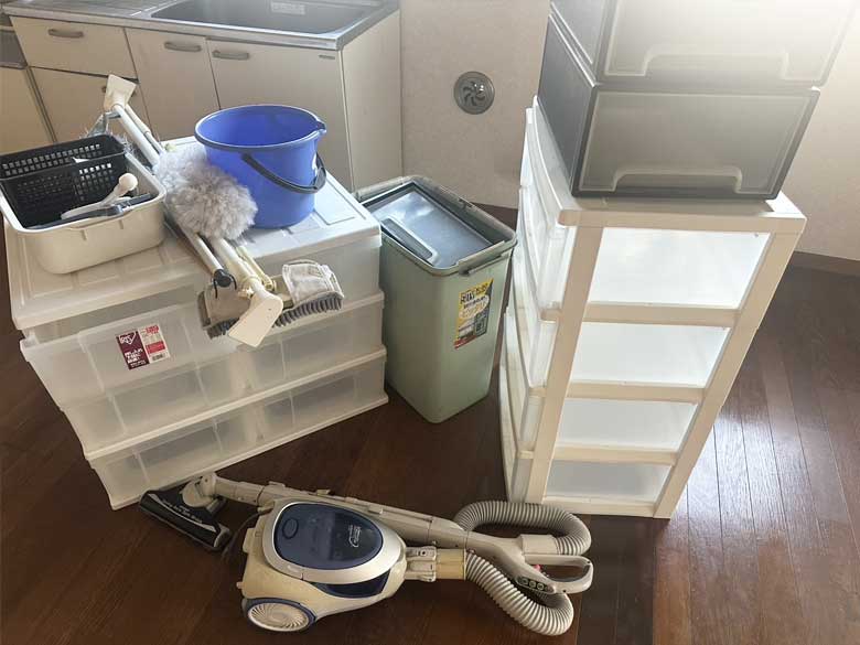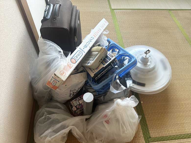 キャリーバッグ×2 、洗濯カゴ 、ダッシュボード×3 、4段キャビネット、45リットル袋×3〜4 、キャビネット、照明、ゴミ箱