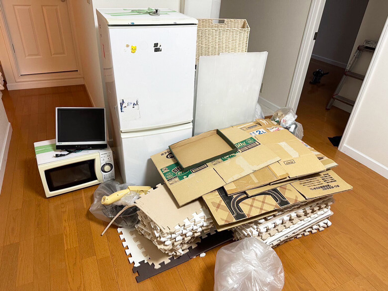 2ドア冷蔵庫、電子レンジ、小型液晶テレビ、プラスチックダンボール、フロアマット×26、中身なしダンボール×10
