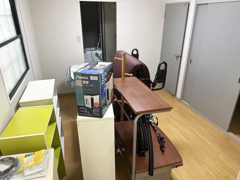 6kg洗濯機 、32型デジタルテレビ、 冷蔵庫、本棚×2 、カラーボックス、床座り用PCデスク、テレビ台 、折りたたみ電動ベッド、介護用シャワーチェア、帽子掛け、キャリーバッグ、シングルふとん一組、毛布1枚、敷毛布1枚、シュレッダー、模擬刀×2、三脚、登山用スティック、角ハンガー、ハンディ掃除機、シンクの三角コーナーなど多少の不燃物