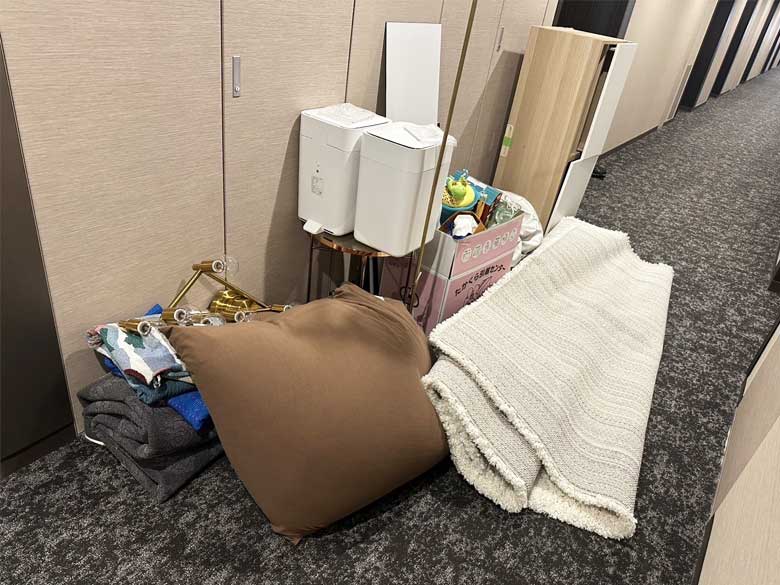 ダンボール入り小物、ビーズクッション、テレビ台、ラグ×4、間接照明、照明、姿見、ゴミ箱×2、サイドテーブル、カーテン