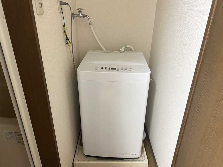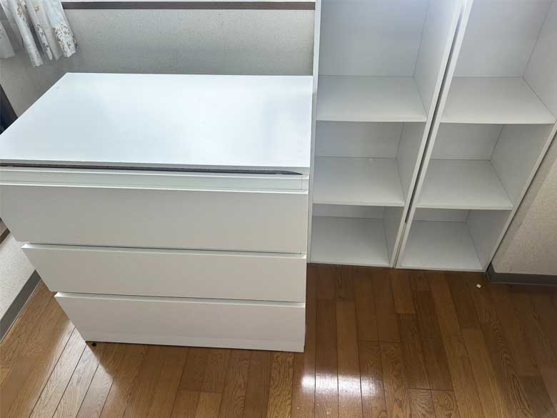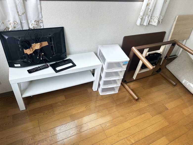 洗濯機、カラーボックス×2、タンス、テレビ台、テレビ、収納プラケース、こたつテーブル、机、ラグ、全身鏡、ワゴン、冷蔵庫、ゴミ袋×7