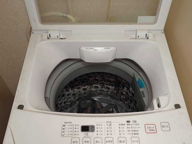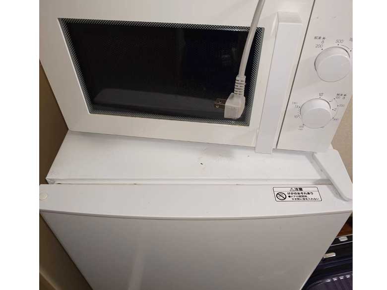 2ドア冷蔵庫、電子レンジ、洗濯機、スーツケース、ベッドフレームシングル、シングルマットレス三つ折り、布団一組、アイロン台、三段棚、折り畳みテーブル