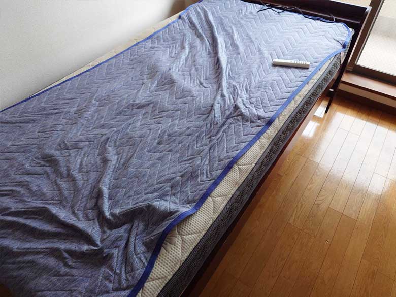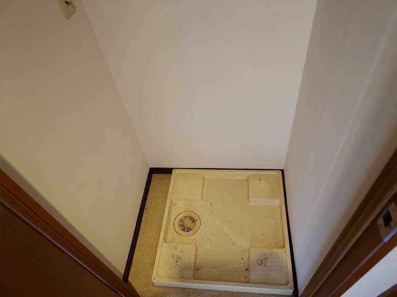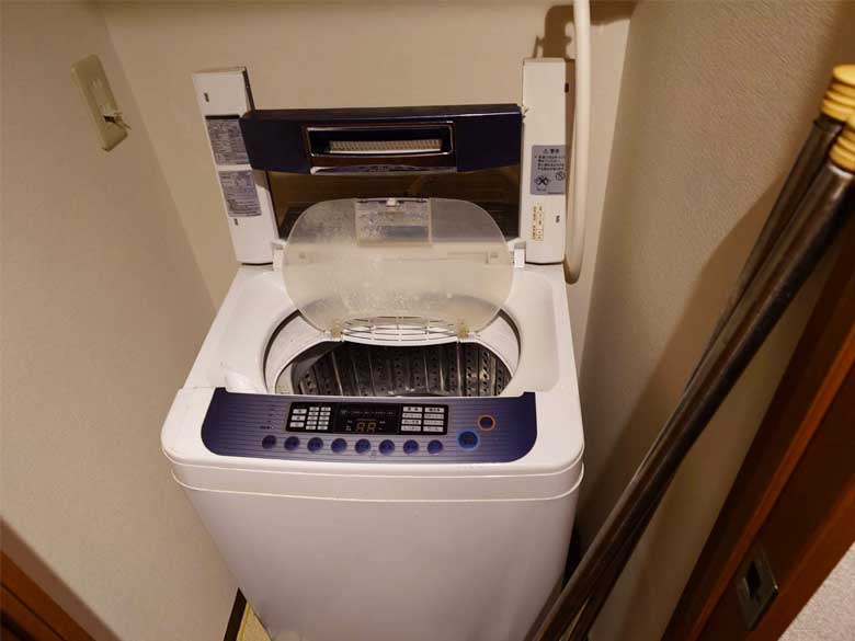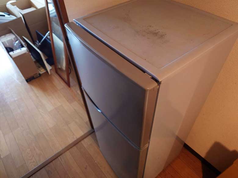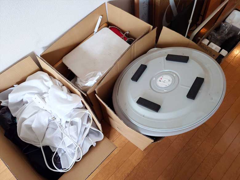 シングルマットレス、ベッドフレーム、単身用冷蔵庫、洗濯機、32型液晶テレビ、全身鏡、物干し竿2本、スーツケース、お風呂の椅子、桶、扇風機、照明器具、細かい雑貨類