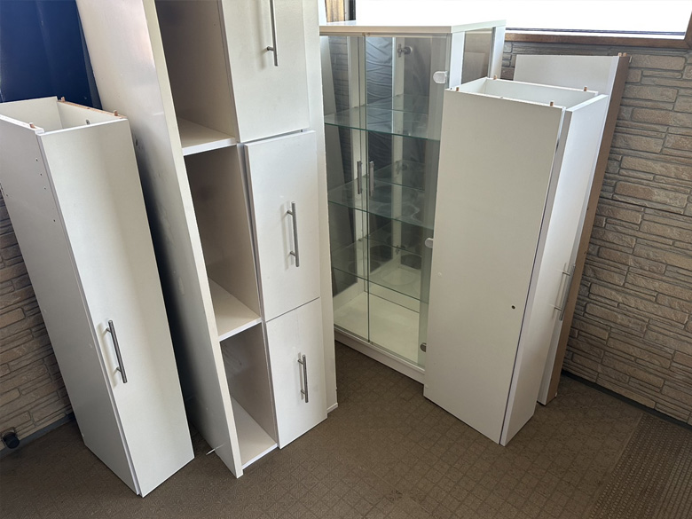 テレビ台(大)、コレクション棚、収納棚×3、メタルラック、アイロン、ローソファーの枠組み、トースター、4段ボックス、折り畳み棚、ラグ