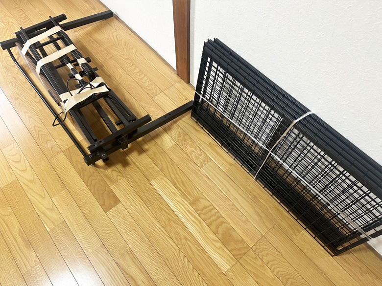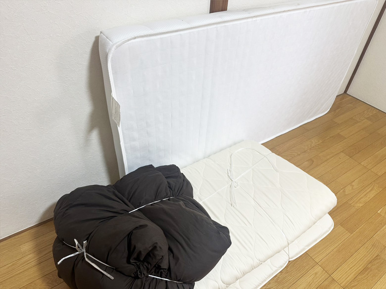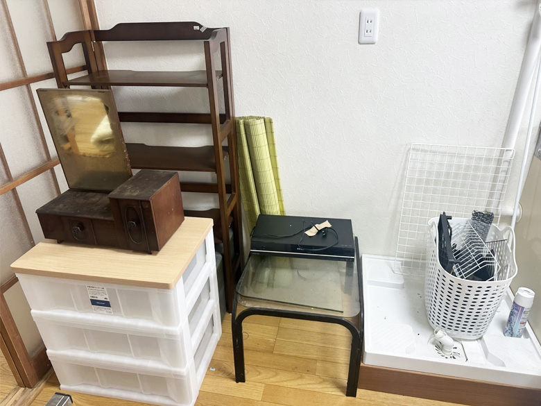 シングルマットレス、羽毛布団、45リットルゴミ箱×2、テレビ台、ガラスローテーブル、プラスチック4段棚、電子レンジ、CDラジカセ、木製3段ラック、5段棚、解体済みパイプベッドフレーム、ガスコンロ、30リットルゴミ箱、トースター、電子レンジ、炊飯器、木の棚