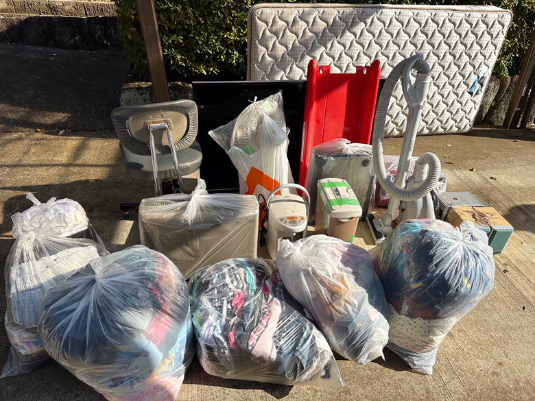 袋ゴミ6袋、椅子、マットレス、テレビ、滑り台、空気清浄機、DVDデッキ、掃除機、シュレッダー、ポット、コンポ、オーブントースター、扇風機