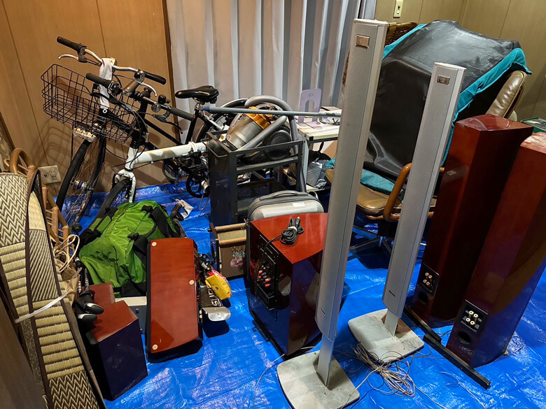 自転車×2、スピーカー×7〜8 、折り畳み机、掃除機、服45リットル袋×10、細かなもの45リットル袋×20、プロジェクター、椅子×2、額×2、テレビ、テレビ台、座椅子、ゴザ、バック、シューズラック、ワゴン、棚、ステッキ×9