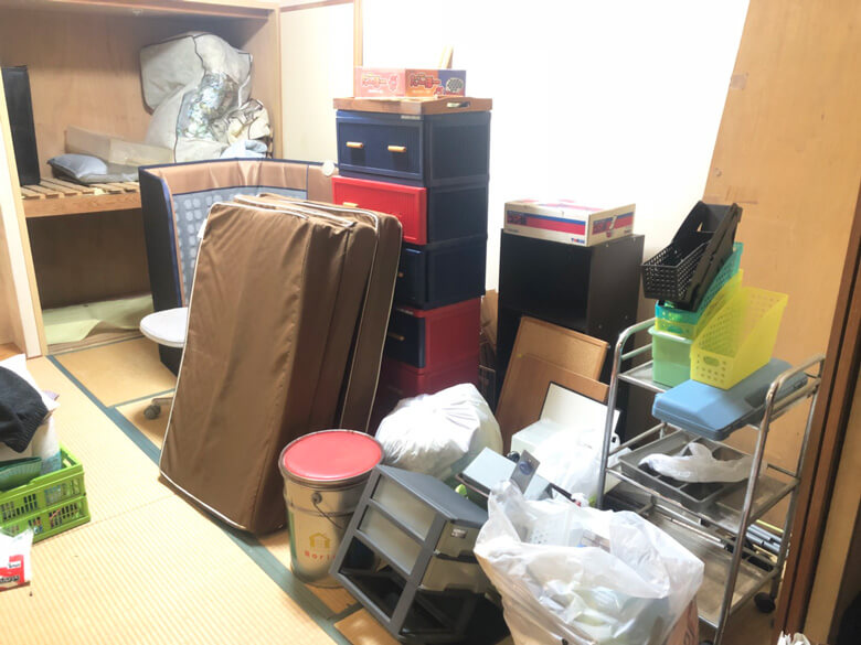 折りたたみマットレス2つ、3段衣装ケース2つ、スチール棚、カラーボックス、布団1組、コルクボード、書類用ケース7つ、工具箱、椅子、45リットルゴミ袋4つ(衣類入り)