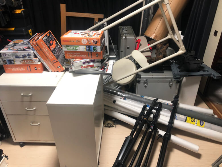 木製棚小サイズ2つ、雑誌15冊〜20冊、プラスチック製枠、巻紙12本、ジュラルミンケース4つ、巻きダンボール、PCディスプレイ、椅子、DVDデッキ、照明器具、板9枚、三脚12本、台車、その他小物45リットルゴミ袋3つ