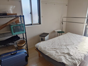 2ドア冷蔵庫、電子レンジ、レンジ台、テレビ台、液晶テレビ2台、DVDデッキ、シングルベッドマットレス付き、衣装ケース8つ、布団1組、掃除機、空ダンボール