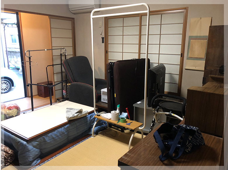 こたつ机、化粧台、小ダンス、テレビ、テレビ台、折りたたみベッド、洋服掛け、マッサージチェア、ハンガーラック、健康器具、電子レンジ、小棚、45リットル袋2個(衣類)