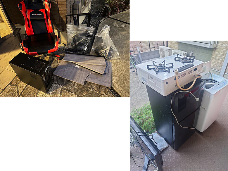 ゲーミングチェア、袋×2、天板×4、デスクトップPC、冷蔵庫、洗濯機、ガスコンロ