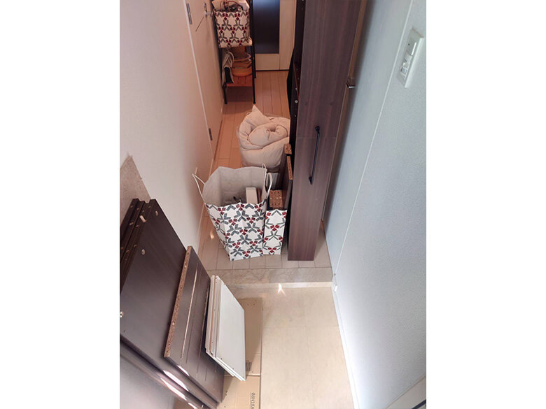 今回は本棚の処分と併せて細かなお品物も一緒に回収をご依頼頂きました。回収品を玄関にまとめて置いて頂いており、細かい品物も袋にまとめてくださっていたので短時間で作業終了となりました。