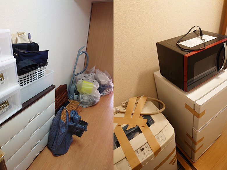 冷蔵庫、洗濯機、電子レンジ、掃除機、ミニアイロン台、ハンガーラック(分解済)、衣装ケース3個、その他ごみ(小物入れ・CD・かばん・ダンボールなど)45リットル袋×15相当、洋服キャビネット