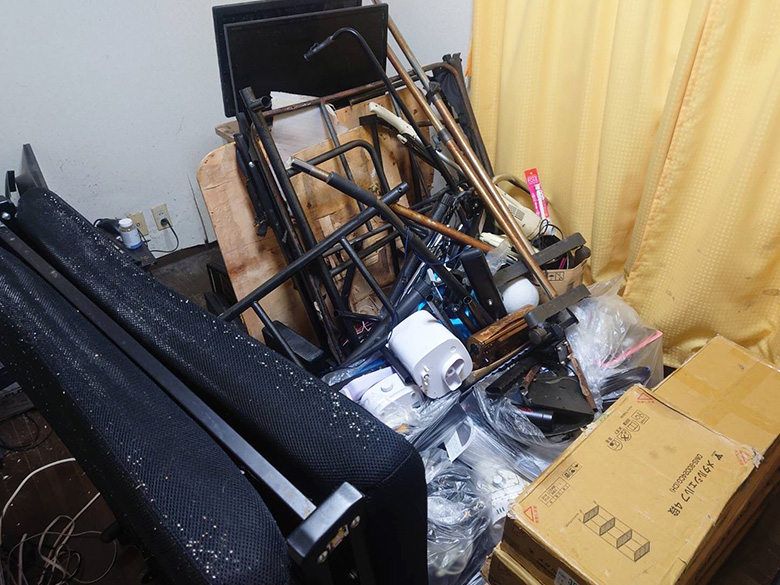 折りたたみベッド、組み立て前のカラーボックス×6、モニター×2、ゲーム機×4、衣装ケース4段、小型家電類×6袋、スクラップ・金属類、スチールラック(小)×3