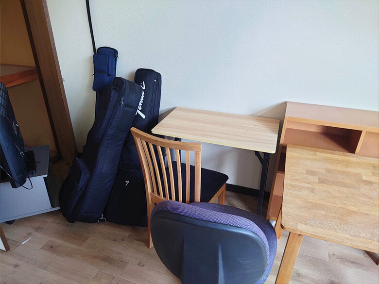 シングルベッド、マットレス、布団、デスク、椅子3、本棚、テレビ、テレビ台、ギター4、扇風機、炊飯器、折りたたみ机2、物干し竿2