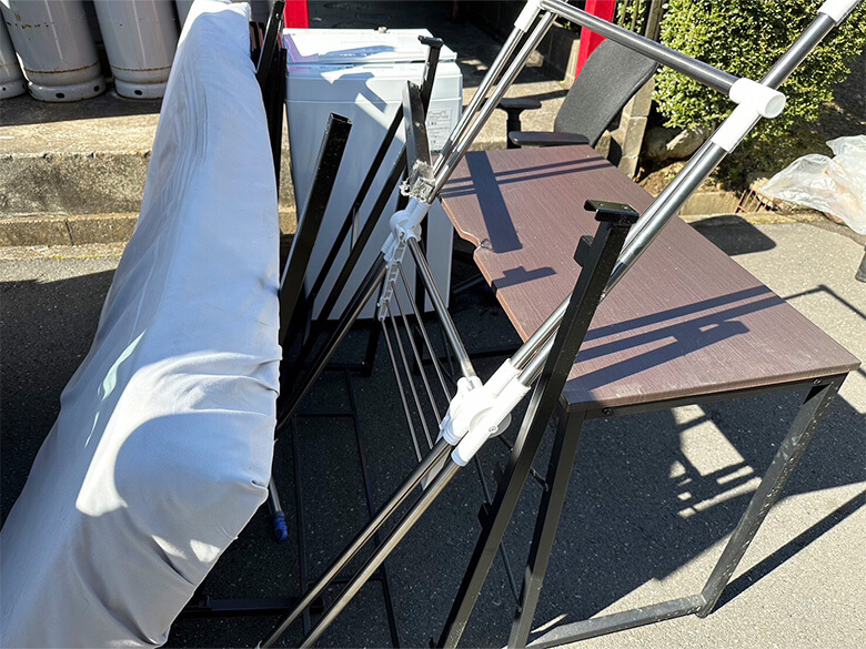 解体済みスチール棚(棚板6、スチール部品2)、丸椅子、クリアケース、ファックス機、すだれ、折りたたみ椅子、キャスター付き引出し、折りたたみ済みダンボール15、縦型洗濯機、シングルサイズマットレス、机、イス、ステンレスX型物干し、シングルパイプベッド、物干し竿